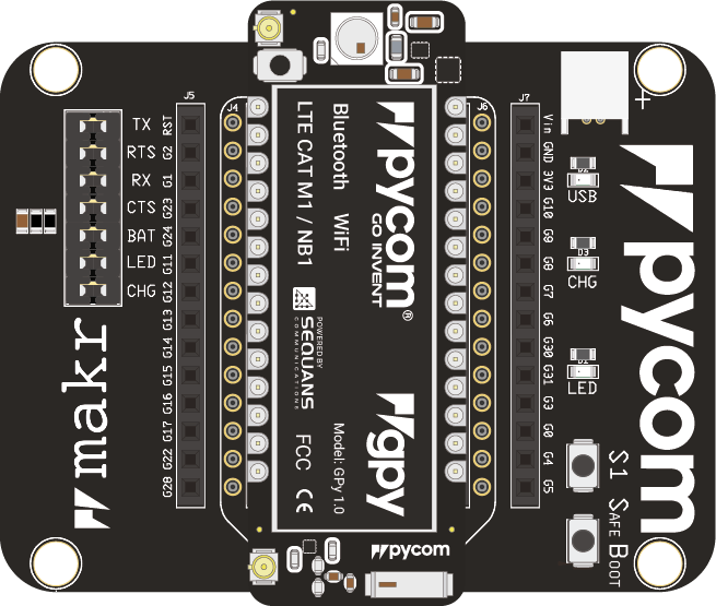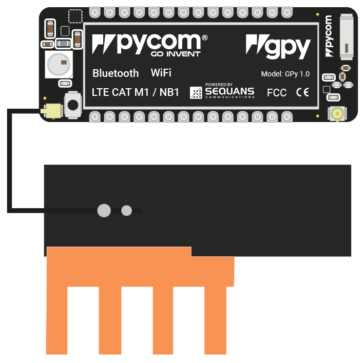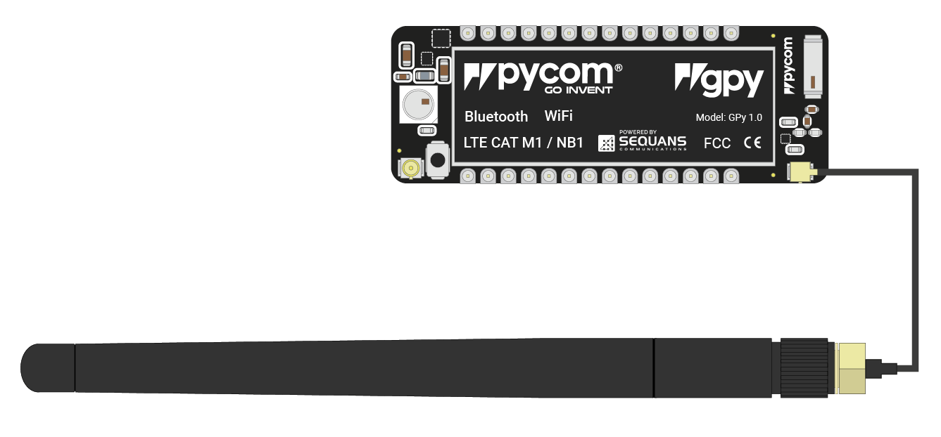 - You will need to connect the antenna to the GPy using the U.FL connector on the same side of the GPy as the LED.