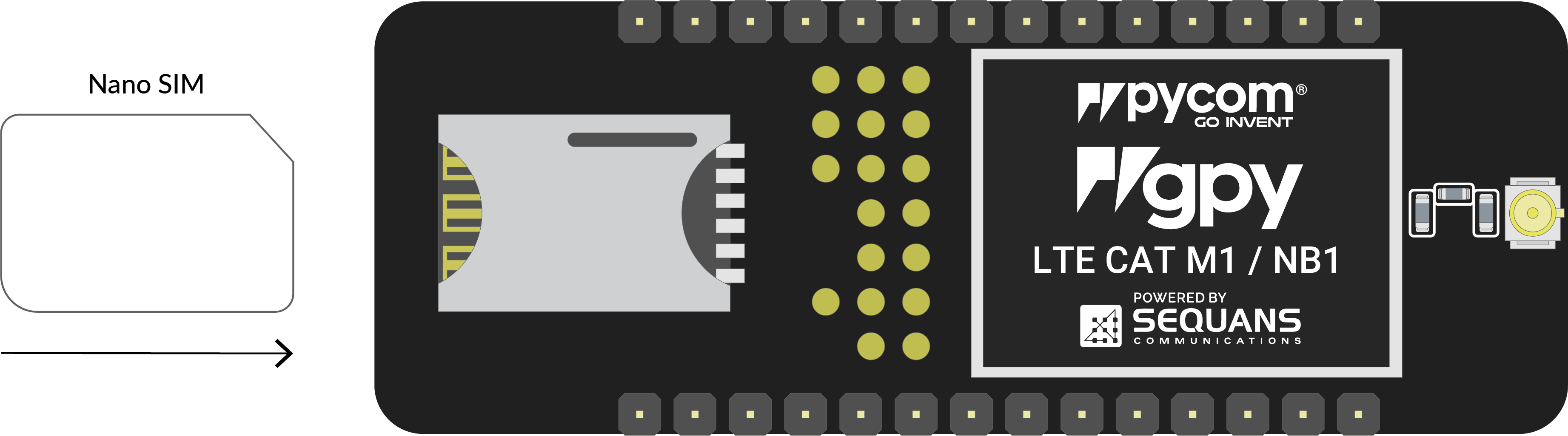 If you intend on using the LTE CAT-M1 or NB-IoT connectivity of the GPy you will need to insert a SIM card into your GPy. It should be noted that the GPy does not support regular LTE connectivity and you may require a special SIM. It is best to contact your local cellular providers for more information on acquiring a LTE CAT-M1/NB-IoT enabled nano SIM.